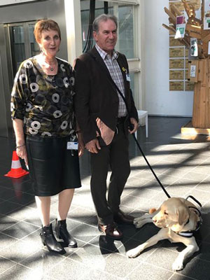 Roland Welter erzählte in Anwesenheit seiner Frau Chantal und seines Blindenführhundes Loua über des täglichen Lebens eines Sehbehinderten mit einem Blindenführhund